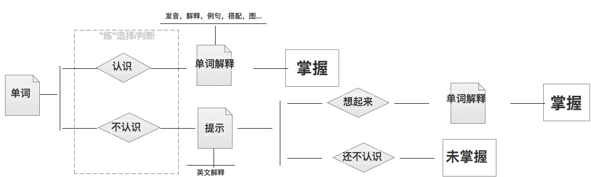 流程设计上,考察是否同学们对单词的掌握程度,到底掌握,熟悉有印象,还是完全不认识。大家学习英语胶囊,我们通过大数据学习大家,将来针对单词的不同掌握状态,我们也会涉及不同的场景反复出现。产品狗曰:一个陌生单词不同出现在6个地方,用户就印象更深。