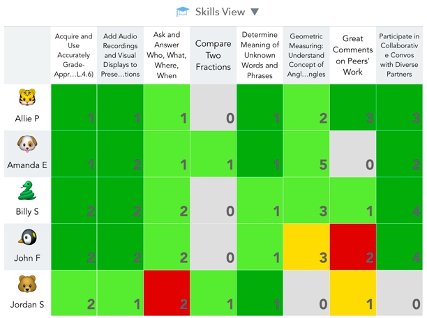 - 教师端可设置Skill,然后以skill view来查看学员的掌握程度,评价的载体是学员发布的日志。用黄,红,绿来分别表示掌握程度;